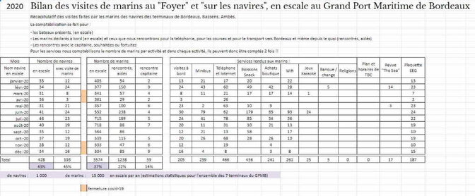 L’année 2020 a été rendue difficile par la crise sanitaire et les contraintes réglementaires mises en place pour protéger les marins et bien sûr les bénévoles et permanents. Ces derniers se sont mobilisés pour assurer le service qui ne pouvait plus se faire au "Foyer" mais avec le minibus sur les quais, à la coupée, afin que les marins ne se sentent pas abandonnés quand ils séjournaient dans le Grand Port Maritime de Bordeaux.
